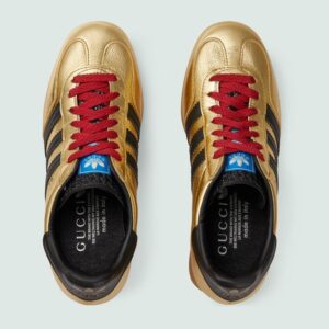 The Adidas x Gucci Gazelle Metallic Gold is a striking blend of luxury and sport. With a bold metallic gold upper, this sneaker exudes high-fashion appeal while maintaining the classic Gazelle silhouette. Iconic Gucci accents elevate the design, making it a statement piece for those who appreciate daring, standout footwear.