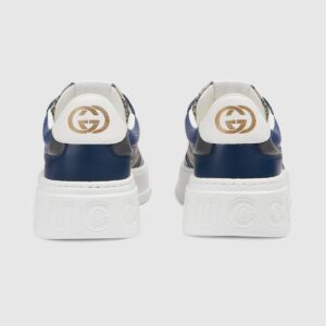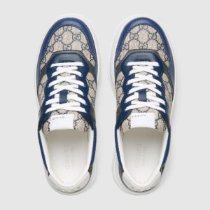 Mirroring the material’s historic origins, GG Supreme is introduced in a timeless mix of blue and beige for Gucci Love Parade. The canvas has come to the front of each collection decade after decade to become a hallmark of the House. Here, the classic palette defines this pair of trainers.