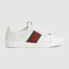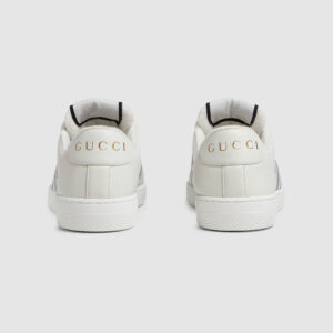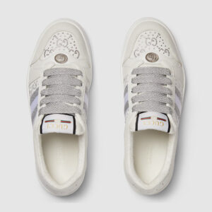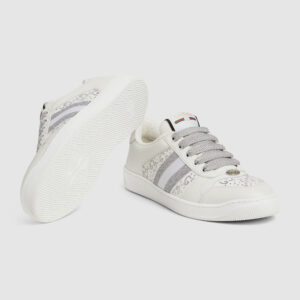 Influenced by classic trainers from the ’70s, the Screener sneakers—named for the defensive sports move—feature the Web stripe on the side and the vintage Gucci logo. Here the style is reimagined in grey leather and white GG Crystal canvas, while a grey and white glittery Web completes the style.