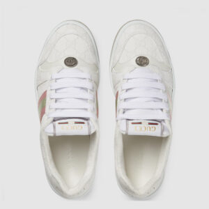 Influenced by classic trainers from the 1970s, the Screener sneakers is named for the defensive sports move. This variation, in white GG Supreme canvas, features a unique pink and green Web stripe on the side and the vintage Gucci logo.