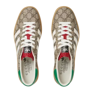 The Gucci x Adidas Gazelle Beige GG Monogram merges luxury and streetwear, featuring the classic Adidas Gazelle silhouette adorned with Gucci’s signature beige GG monogram. The sneaker combines soft suede, retro-inspired design elements, and distinctive branding from both fashion houses, making it a standout choice for sneaker enthusiasts seeking elegance with a sporty edge.