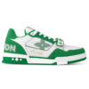 The LV Trainer is made from Monogram Denim and features Velcro on the laces for adjustable width. Designed by Virgil Abloh, this iconic shoe is inspired by classic basketball shoes. Featuring a bold colorway, the shoe is finished with Monogram flowers on the strap, outsole and sidewalls.