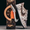 Louis Vuitton and Nike expression of the “Air Force 1” by Virgil Abloh. The LV monogram debossed throughout the upper and Swoosh. Signature Off-White details are also found, like the off-center tongue label, bright green tabs, and the quoted “AIR” text across the midsole/laces.