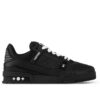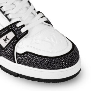 This exceptional edition of the cult LV Trainer sneaker combines grained calf leather with sparkling Swarovski™ crystals on its graphic, bicolor design. Designed by Louis Vuitton Artistic Director Virgil Abloh, this iconic style was inspired by basketball sneakers. This cult sneaker is notable for its elaborately constructed upper, which takes seven hours to stitch, and for its rich details, including a bicolor rubber outsole decorated with Monogram Flowers.