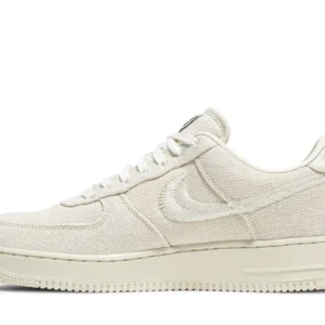 The Stussy x Nike Air Force 1 Low ‘Fossil’ is a sneaker that resulted from a partnership between Nike and the pioneering streetwear brand, Stussy. The shoe’s upper is made of natural hemp material, giving it a unique look. The shoe has several distinctive branding elements, such as a split-embroidered Swoosh, a double ‘S’ stitched on the toe box and a Stussy World Tour tongue tag. The double ‘S’ repeats on a metallic emblem that embellishes the interwoven heel tab. Underfoot, the shoe’s neutral color palette is complemented by its off-white rubber cupsole.